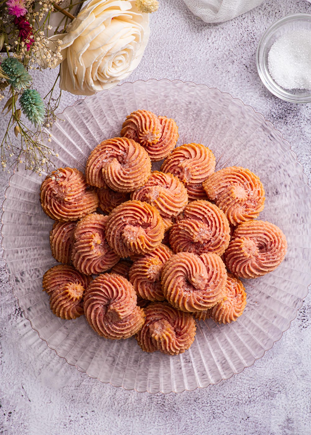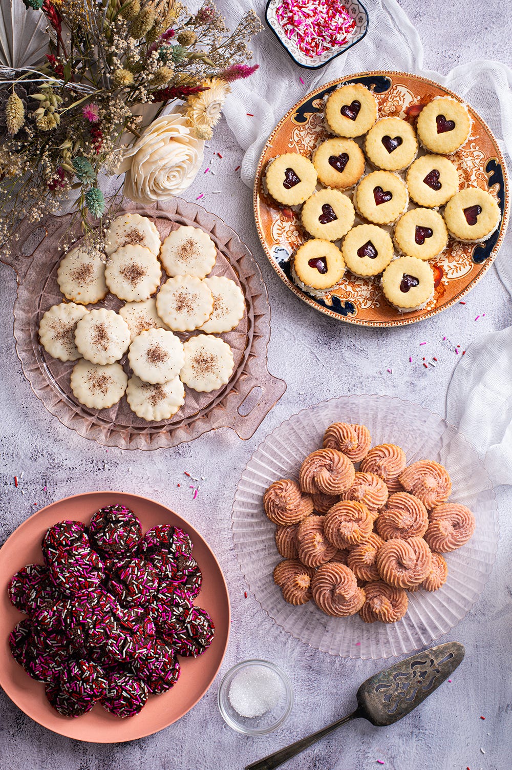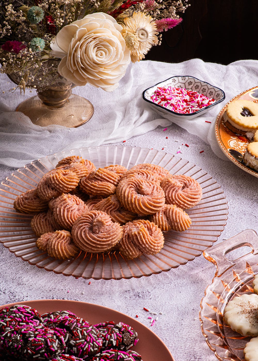 And finally, to round out the stack, we have these Strawberries and Cream Whipped Shortbread. These naturally pink pretties feature a traditional shortbread base flavoured with blitzed freeze-dried strawberries and a dollop of yogurt - full-fat, please and thank you. These are among the easiest cookies to make on this list, but they were the hardest to develop. Getting the right mix of yogurt, cornstarch, and butter was an absolute nightmare. The yogurt made them easier to pipe, but too much of it, and the cookies completely lost their shape in the oven. The cornstarch helped them maintain their beauty, but too much gave them a chalky mouthfeel.
