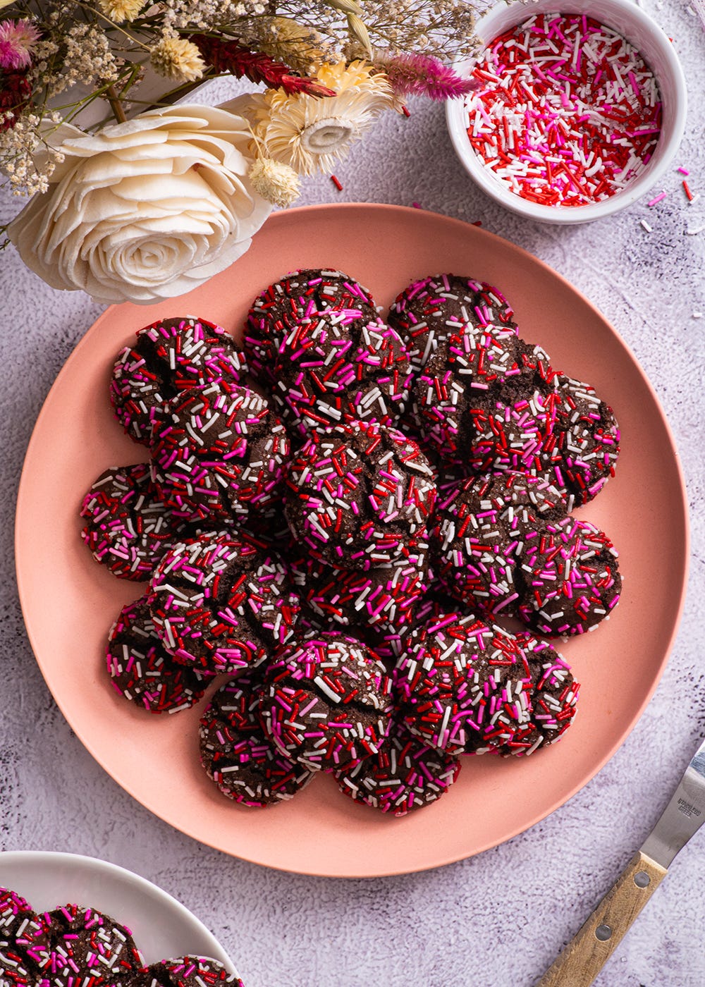 Next, we have these Chocolate Gingerbread Sprinkle Cookies. These are essentially chocolate crinkle cookies with the addition of gingerbread spice and a whole whack of pink, white, and red sprinkles. I also added a little sanding sugar for some extra sparkle. I thoroughly enjoyed these, but I will say: pay attention to the quality of your sprinkles. My sprinkles had been in my cupboard a little too long, so their flavour was a little, um, stale. Not ideal when sprinkles are such a big part of the show. So invest in fresh sprinkles, they’re worth it. I mean, you could omit sprinkles altogether and simply roll these beauties in powdered sugar before baking to highlight their cracks. But when there is a question between pink sprinkles and no pink sprinkles, I tend to err on the side of sprinkles.
