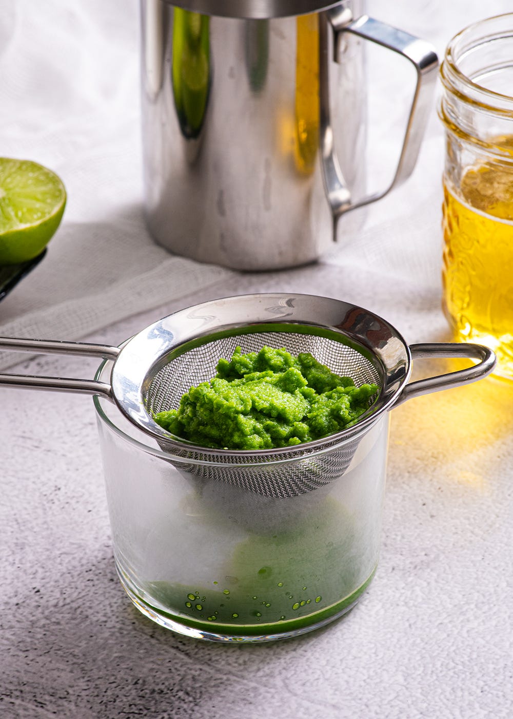 Now, for the actual celery. If you have a juicer, this is a good time to dig it out. If, like me, you don’t have a juicer, a high-powered blender or food processor will do just fine. You will have a use a little more elbow grease to extract the juice. Blitz a few stalks of celery and two limes’ worth of juice until extremely fine. Place the celery in a fine mesh strainer and, using a muddler, extract as much juice as you can. You will get roughly 1/3 of a cup to 1/2 cup of juice for your pains. I like to add a little pinch of salt to my juice to bring out the savoury side of the celery. It will serve as a nice counterpoint to the simple syrup.