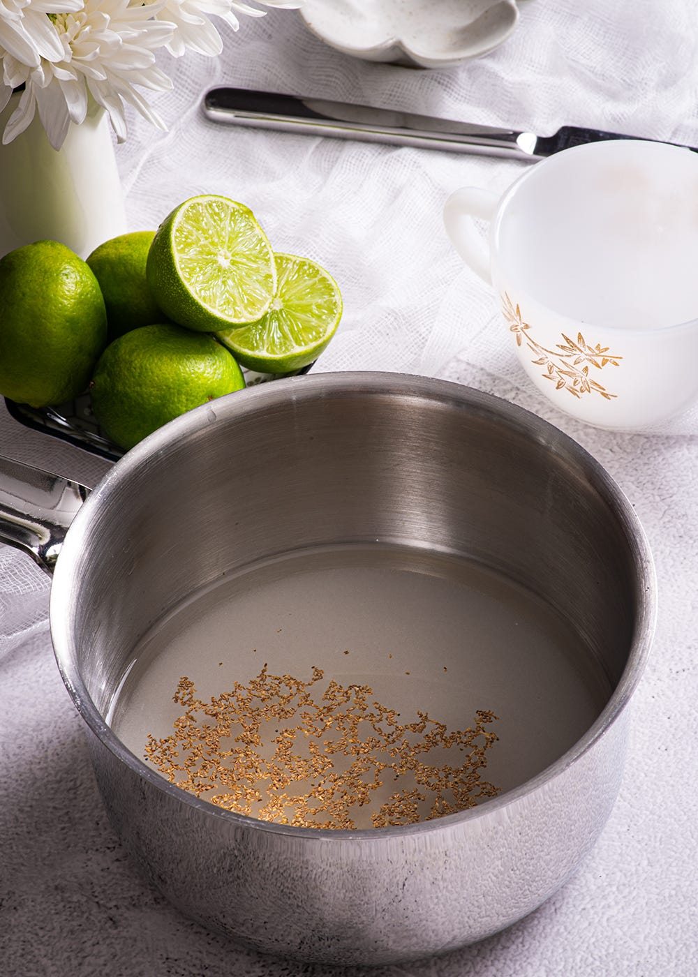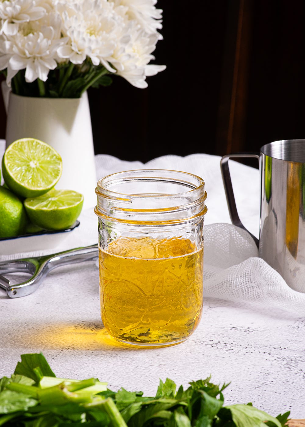 The first thing we’re going to do is make a celery seed simple syrup. A simple syrup is equal parts sugar and water, cooked in a small saucepan over low heat. You will find this in almost every craft cocktail. In this drink, we’re inviting celery seed to the party because I want this gimlet to scream “celery,” not just whisper it. So pour sugar, water, and celery seed into a small saucepan and bring everything up to a boil. Reduce the heat to a simmer and cook for 15 minutes. Strain the syrup into a heatproof jar and let it cool completely. The syrup can be made in advance and will last for a couple of weeks when stored in the fridge.
