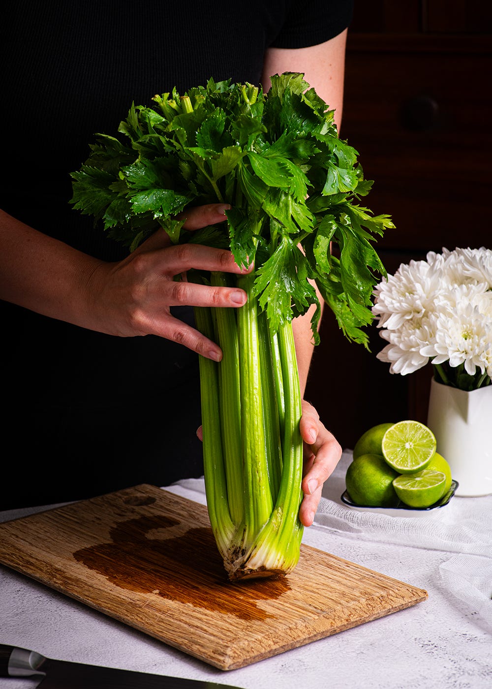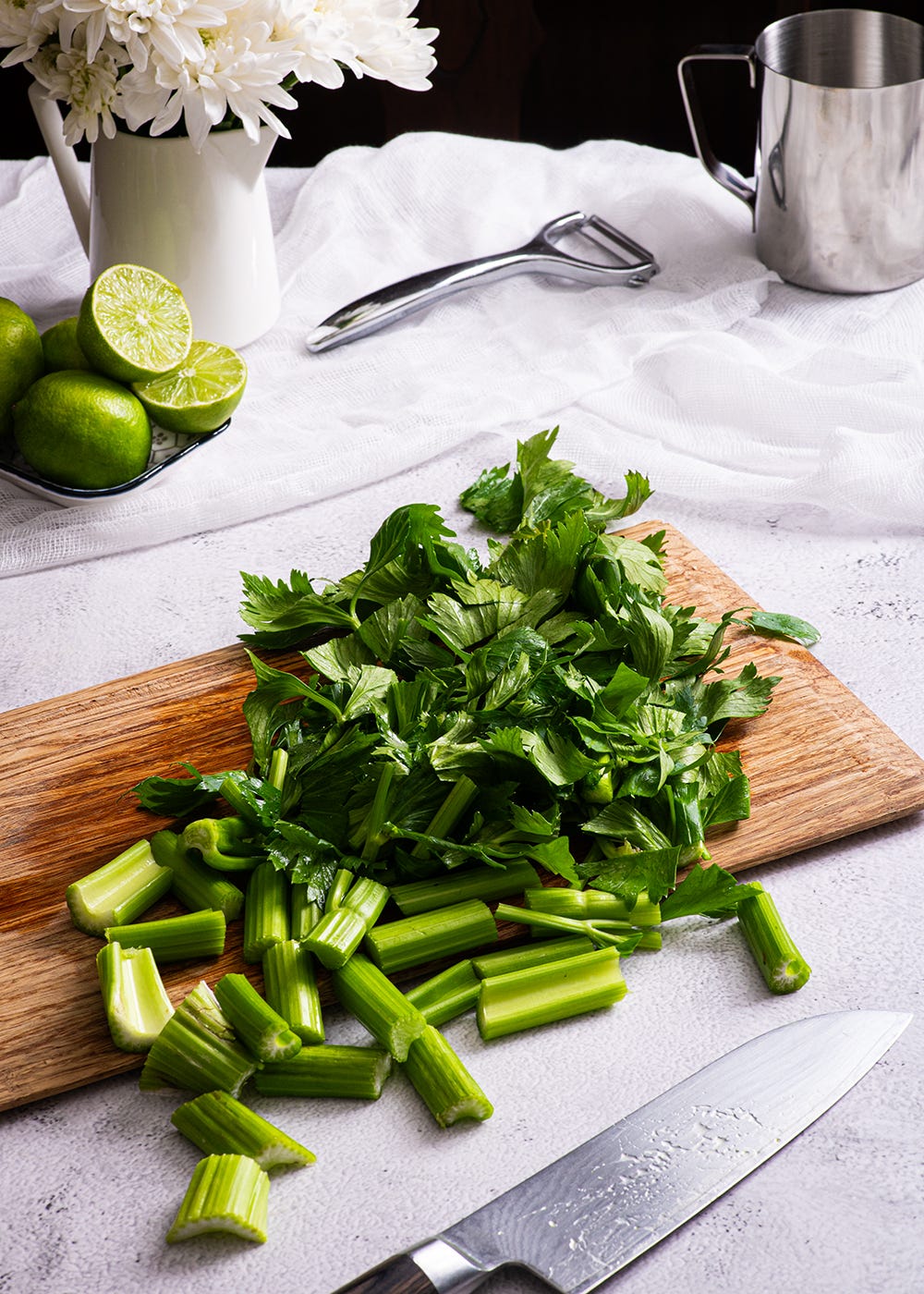 Place the celery in a smoothie cup, food processor, or high-powered blender. Add the lime juice and blitz until very smooth. Working in batches, place the puree in a fine mesh strainer and, using a muddler, press to extract the juice. You should have between ⅓ cup to ½ cup of juice. Stir in a pinch of salt. Chill until ready to use.