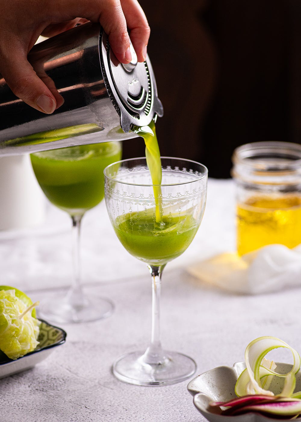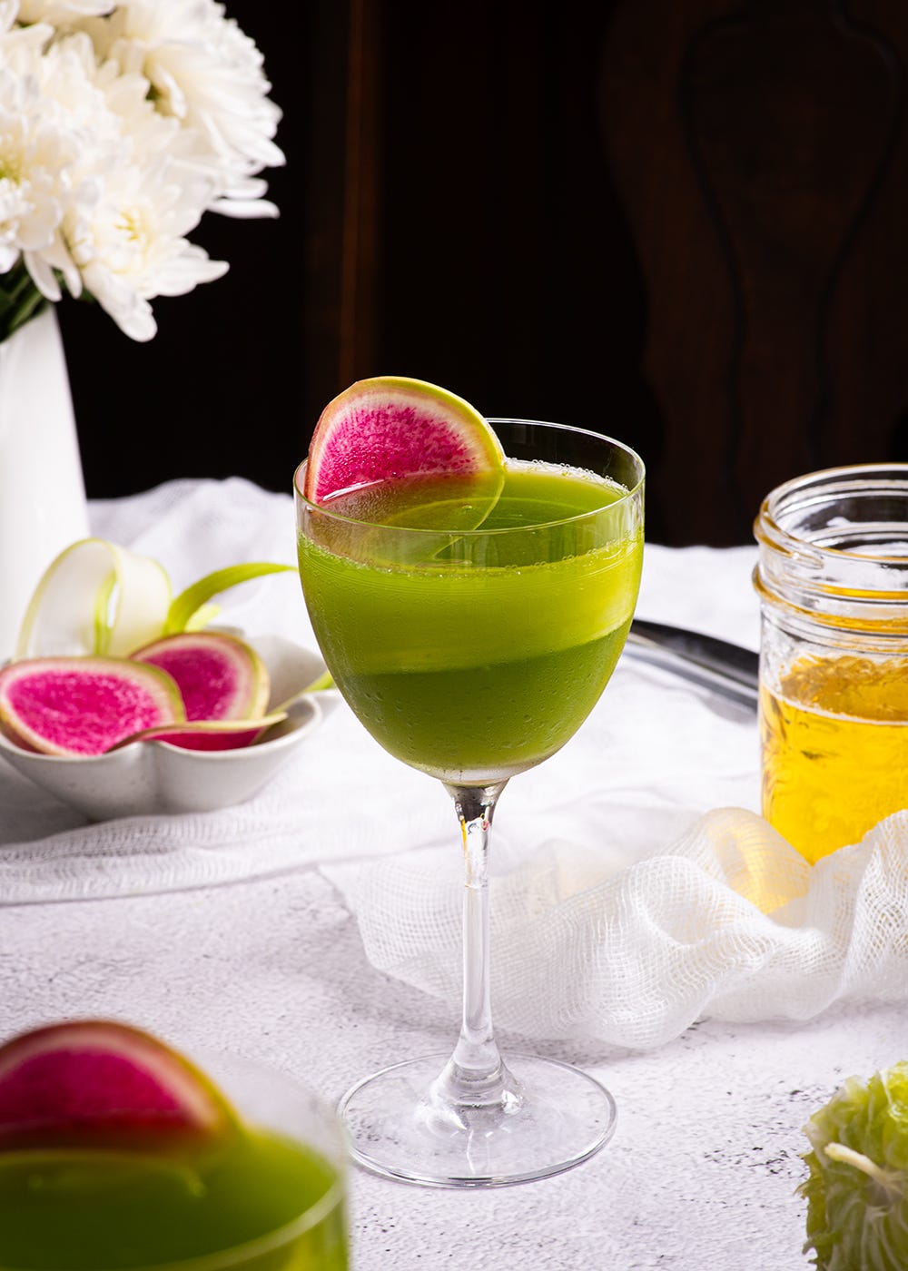 Okay, so with all the prep out of the way, it’s time to shake up the drinks. Pop some Nick & Nora glasses in the freezer to get them nice and chilled. You could also use coupe or martini glasses if you don’t have any Nick & Nora glasses handy. Fill a shaker with ice and add some gin, the syrup you made, Green chartreuse, lime juice, the celery juice, and some celery bitters. Shake the cocktails until frost creeps up the side of the shaker tin. Strain the drink into the chilled glasses and garnish with shaved celery ribbons and a slice of watermelon radish. The radish appears elsewhere on the menu, so I thought it would be good to use it here as well. I think it gives the drink a nice bit of earthiness.